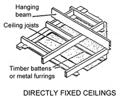 The timber joists with gypsum plasterboards as ceiling panels is the most common directly fixed ceiling. The ceiling boards and timber batten are fixed to:-
