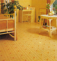 Fig. 10 An attractive design of vinyl tile flooring Checks For Material Quality -The tiles should be stain resistant and of high gloss finish with no-wax wearlayer. -No crisp marks should appear on any vinly tiles and when bent at corners of the floor. -To guard against discolouration, the vinyl tiles should be resistant to mild dew and moisture. -Colour of the tiles should be homogeneous. Checks For Quality Work -As vinly tiles are only 2 or 3 mm thick, no uneveness of the underlayer should be seen on the finished tiles. Vinly tiles may be laid on a screeded floor or a concrete floor. For a screeded floor, a semidry cement-sand mortar of 1: 3.5 to 1: 4.5 levelled to a smooth finish should be used to receive the vinly tile. In the case of a concrete floor (of monolithic finish), an underlay should be provided to receive the tile. A damp-proofing course should also be provided for the ground floor slab prior to laying of vinly tiles. -The floor must be completely dry before fixing the tiles. -This is checked by:-