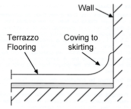 Fig. 9 Coving of inside angle between skirting and terrazzo floor Vinly tiles come in various designs and colours. They may also be in the form of rolled sheets. The distinct advantage of vinly tiles compared with ceramic or marble flooring is that they reduce noise (Fig. 10).