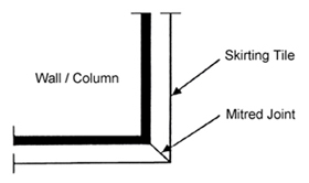 -All joints should be properly aligned. They should be fully grouted with white portland cement slurry and be free from residual cement stains. -Skirting tiles particularly at the protrusion of a wall like the case of a column should be laid in a symmetrical arrangement. A mitred joint should be adopted at the external corner of a protrusion (Fig. 3 & 4).